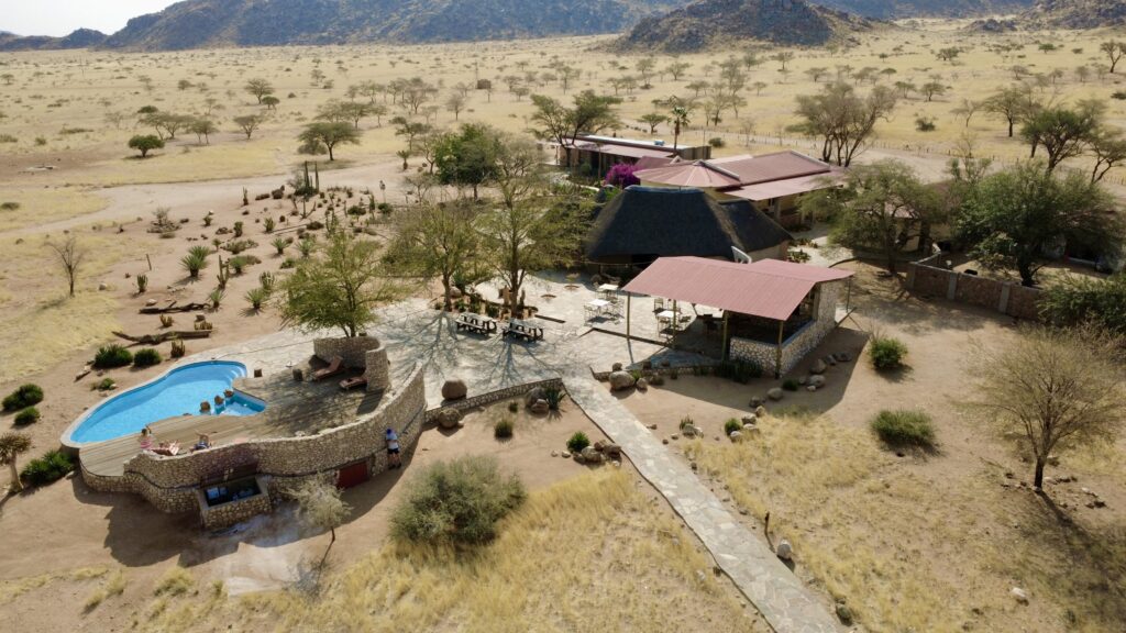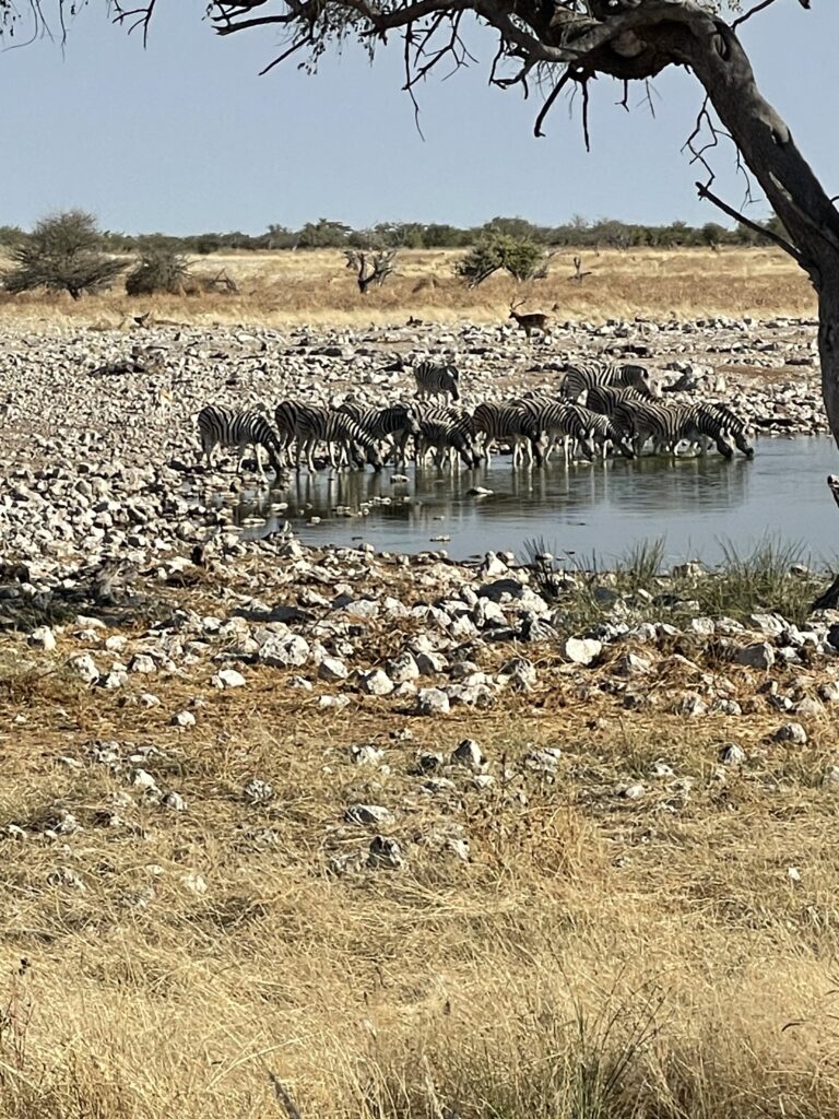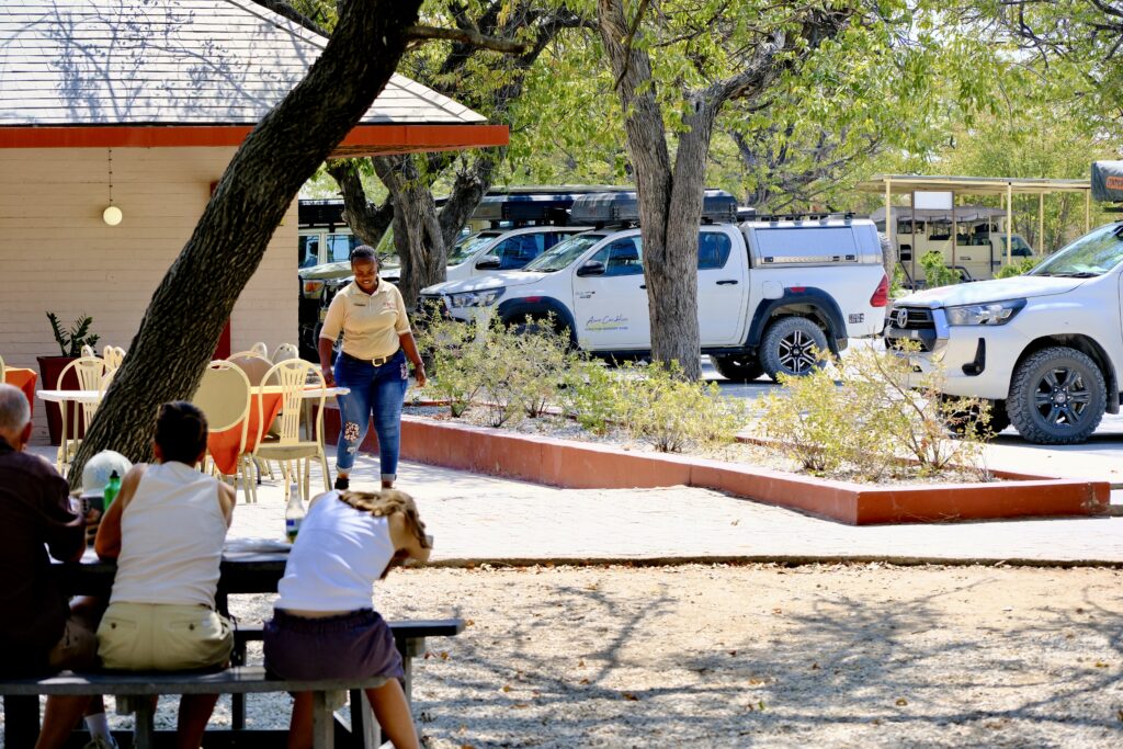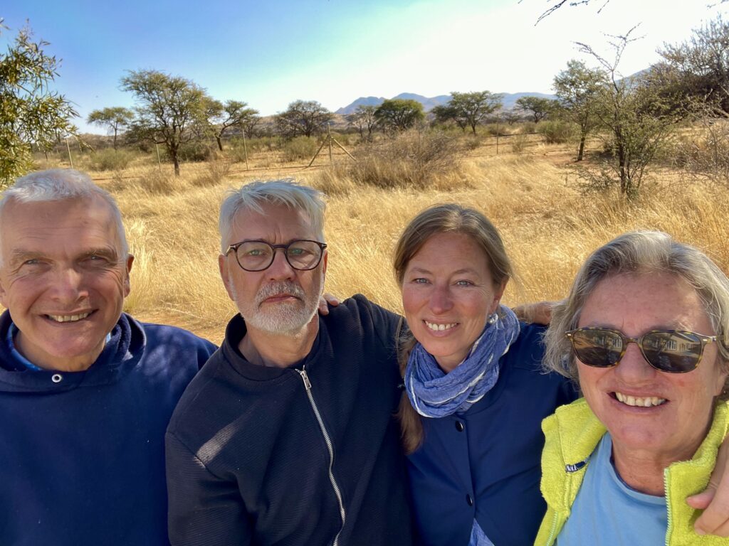 Ob das Foto auf der Laserpistole wirklich von uns war, weiß ich nicht. Zuerst wollten sie 600 Pula, am Ende waren’s dann 200 (13€). Wir bekamen kein offizielles Dokument – man fragt sich aber schon, wo das Geld letztlich gelandet ist. Der Grenzübertritt verlief problemlos – nach dreißig Minuten war alles erledigt.Dann ging’s weiter – durch die Wüste – bis zur Westnest Lodge, die schon in Namibia liegt. Die Lodge gibt es seit etwa 15 Jahren, sie wurde von weißen Namibiern aufgebaut. Der Besitzer erklärte, dass das Gelände eine Mischung aus Zoo und Safaripark ist: zwar eingezäunt, aber mit Giraffen, Zebras, Kudus – und vielen anderen Tieren. Dazu gibt’s Esel, Hühner, Gänse, Ziegen – ein richtiger kleiner Bauernhof mitten im Busch. Das Ganze soll vor allem Kindern ein Tiererlebnis ermöglichen.