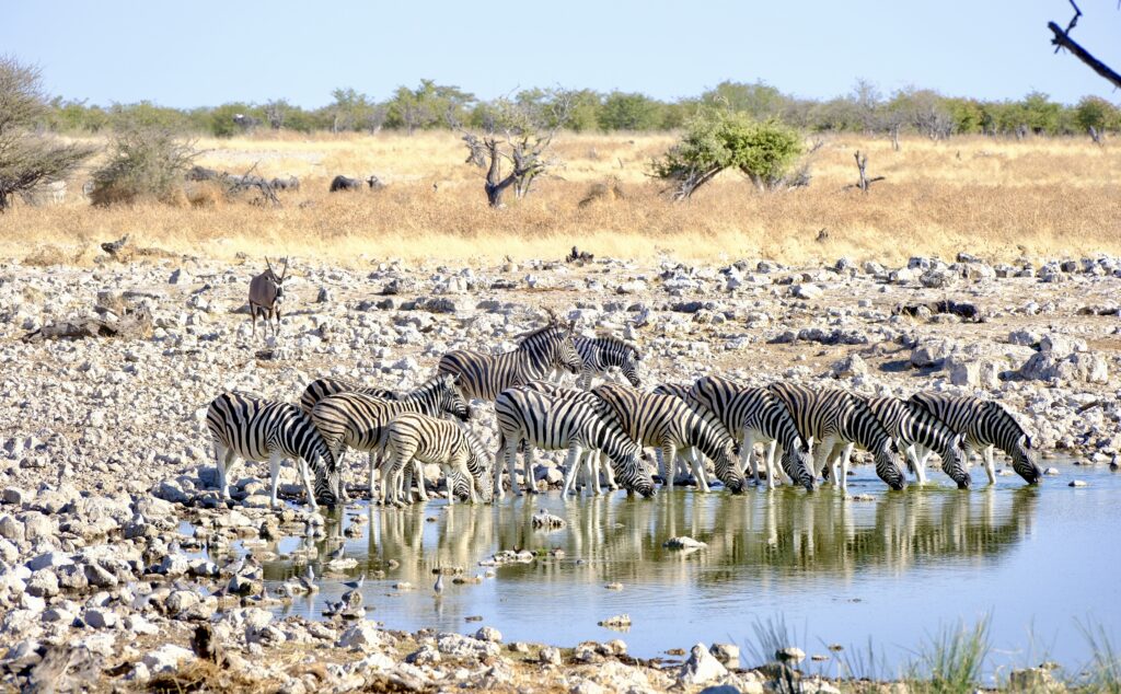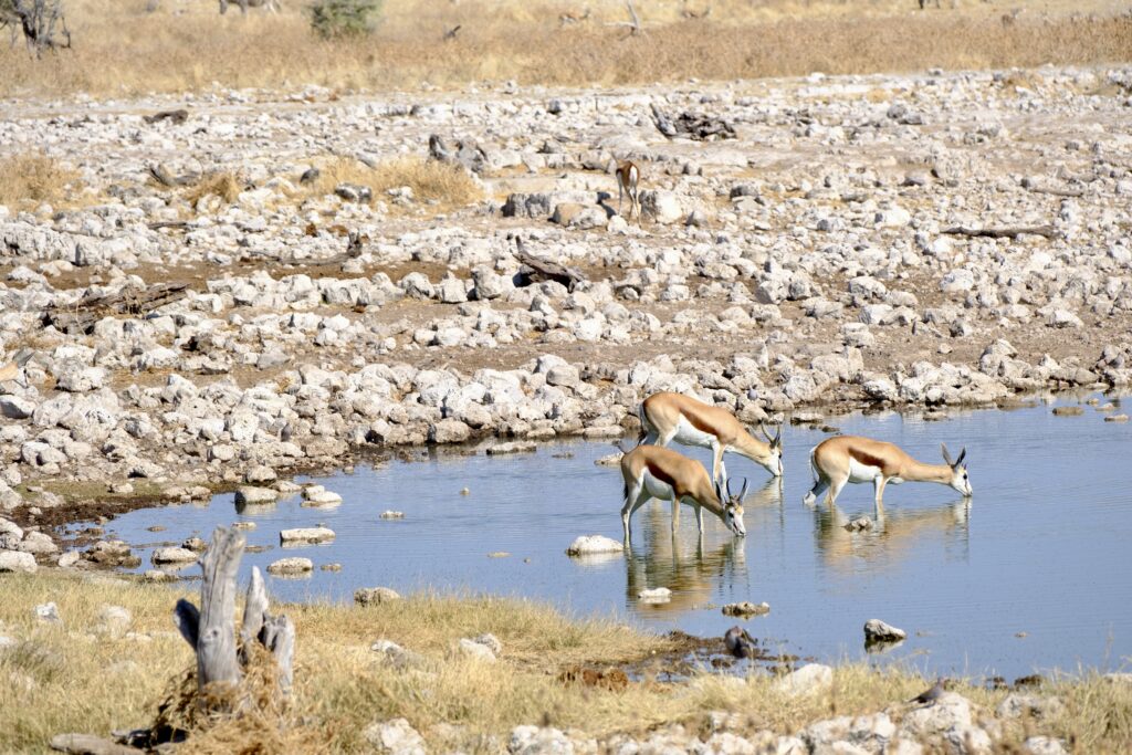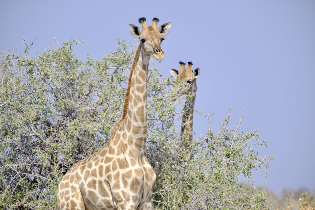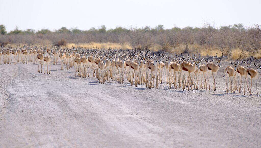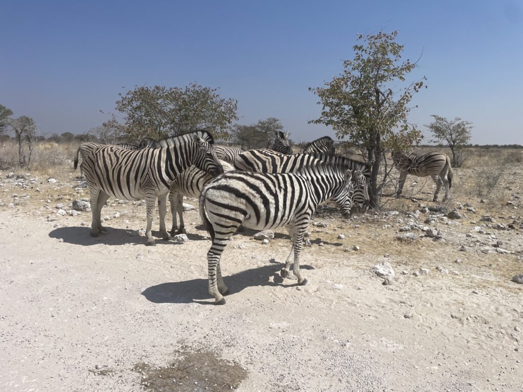 Ob das Foto auf der Laserpistole wirklich von uns war, weiß ich nicht. Zuerst wollten sie 600 Pula, am Ende waren’s dann 200 (13€). Wir bekamen kein offizielles Dokument – man fragt sich aber schon, wo das Geld letztlich gelandet ist. Der Grenzübertritt verlief problemlos – nach dreißig Minuten war alles erledigt.Dann ging’s weiter – durch die Wüste – bis zur Westnest Lodge, die schon in Namibia liegt. Die Lodge gibt es seit etwa 15 Jahren, sie wurde von weißen Namibiern aufgebaut. Der Besitzer erklärte, dass das Gelände eine Mischung aus Zoo und Safaripark ist: zwar eingezäunt, aber mit Giraffen, Zebras, Kudus – und vielen anderen Tieren. Dazu gibt’s Esel, Hühner, Gänse, Ziegen – ein richtiger kleiner Bauernhof mitten im Busch. Das Ganze soll vor allem Kindern ein Tiererlebnis ermöglichen.