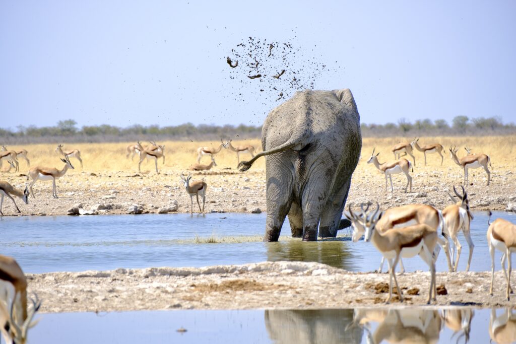 Dennoch habe ich richtig Gas gegeben, so schnell bin ich noch nie eine Sandpiste gefahren, aber wir kamen natürlich noch mal an dem Wasserloch vorbei, wo wir auf dem Hinweg schon vorbeigekommen sind. Anna wollte da unbedingt noch mal hinfahren. Sie hatte den richtigen Riecher, genau in dem Moment, wo die Sonne unterging, lief ein Elefant vor der feuerroten Sonne her: Abendsonne Afrika! Natürlich hat das Foto in meinem Status bei WhatsApp die meisten Likes abgekriegt.