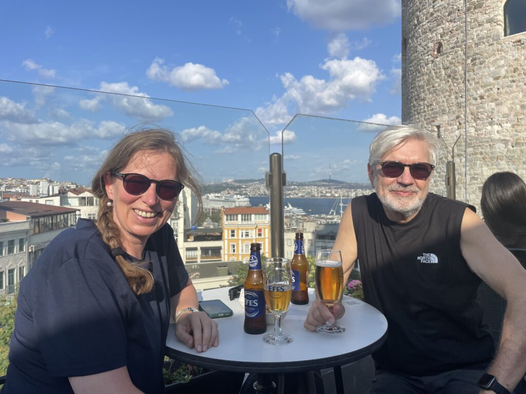 Wir entscheiden uns nicht auf den Turm zu gehen. 30€ Eintritt sind uns zu viel. Alternativ gehen wir in/auf eine Rooftop-Bar, in der das Efe zwar auch 8€ kostet, aber wir genießen beides, das Bier und die Aussicht.