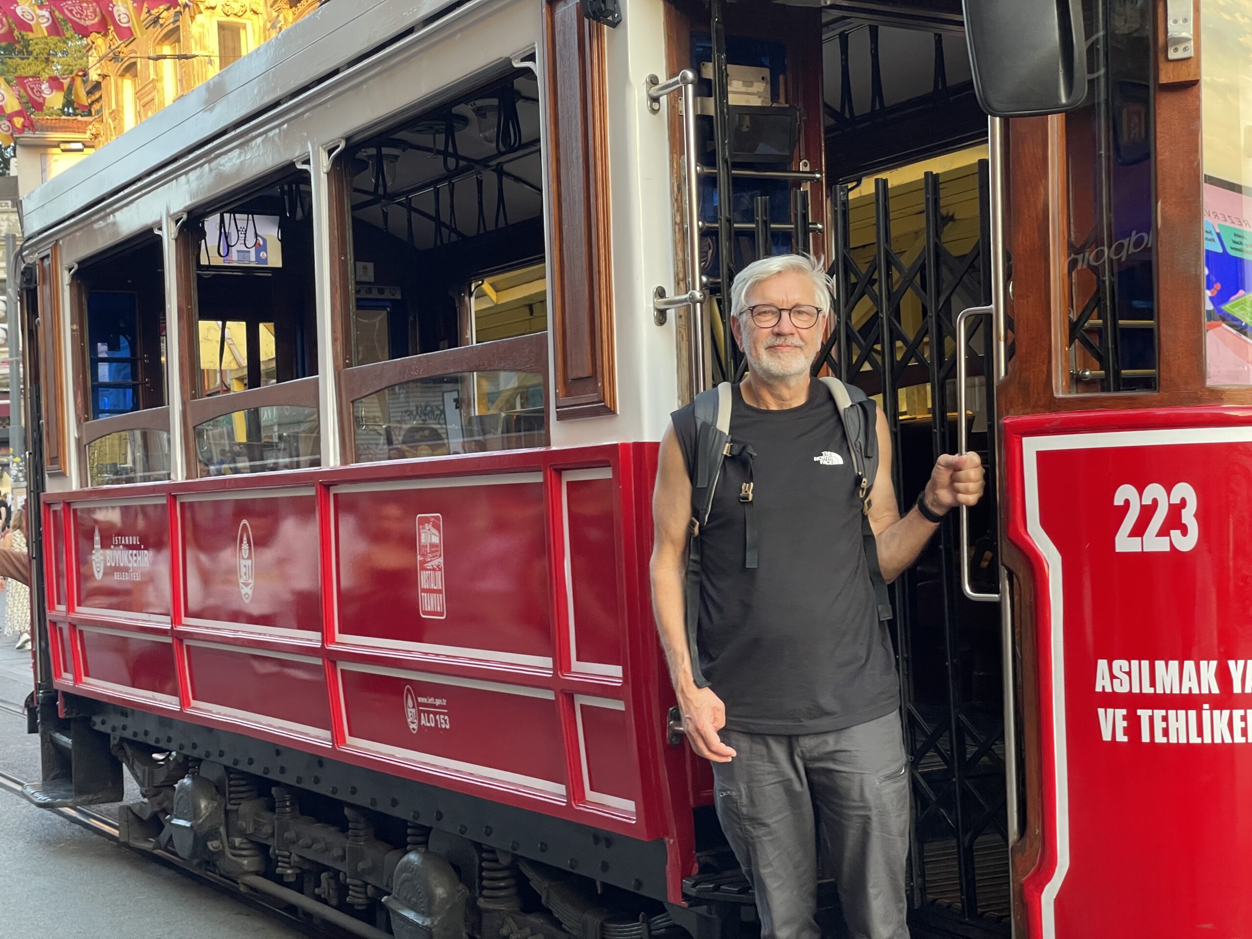Wir gehen zu Fuß von unserem Appartement (Taksim BI Center in der Demirbas Sk) Richtung Galata-Turm, ca. 25 – 45 min, wenn man schlendert, 1,5 km. Man geht durch schöne Gassen und kommt an vielen netten Cafés vorbei. Auf dem Bild sieht man die rote Istanbuler Straßenbahn, die durch die Haupteinkaufsstraße Istanbuls fährt.