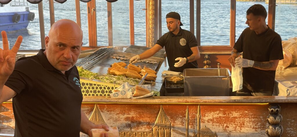 Ich esse hier ein Fischbrötchen direkt vom Kutter (225 TL).
