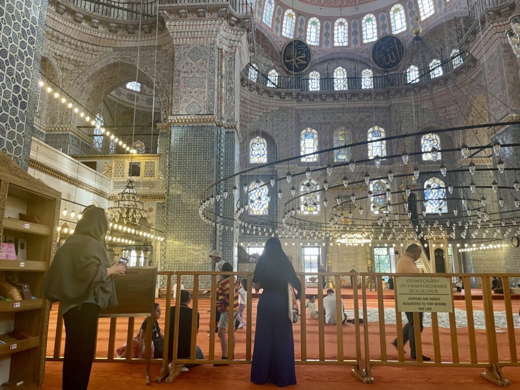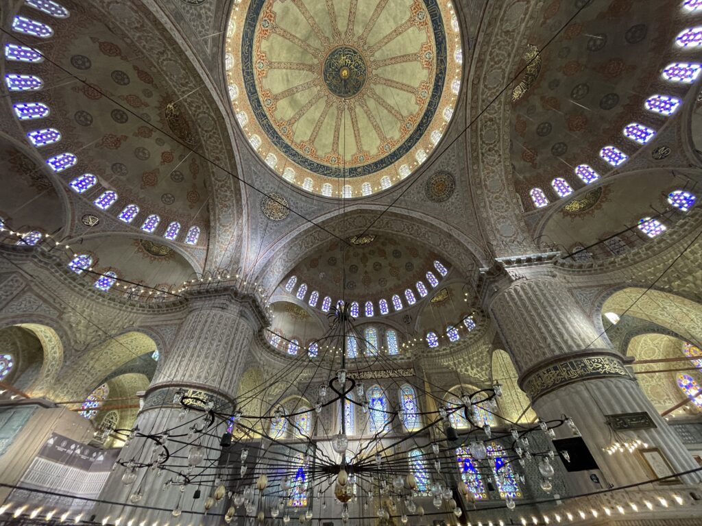 So gestärkt widmen wir uns der Sultan-Ahmet-Moschee. Nachdem wir uns die Schuhe bzw. Sandalen ausgezogen haben und Anna sich ein Tuch über den Kopf gelegt hat, gehen wir hinein.