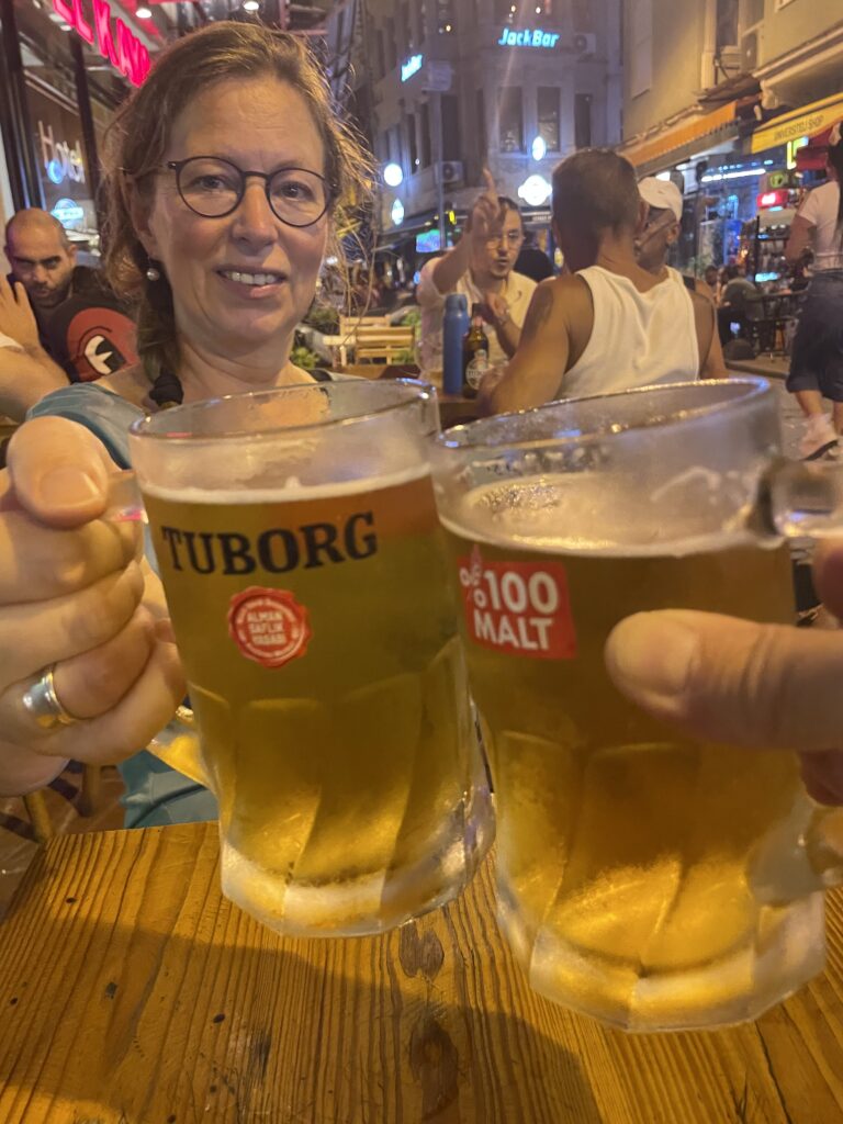 Wir fahren mit der Metro (M2) nach Kabartas und anschließend mit der F1 zum Taksim-Platz. Die F1 ist eine unterirdisch fahrende Seilbahn, die einen Höhenunterschied von ca. 75 Metern überwinden muss. Endlich kommen wir wieder in „unserem“ Taksim-Viertel an und gönnen uns ein Bier. Hier treffen wir noch 2 Jungs (20 J.) aus Münster, mit denen wir uns noch super angeregt unterhalten (leider ohne Foto).