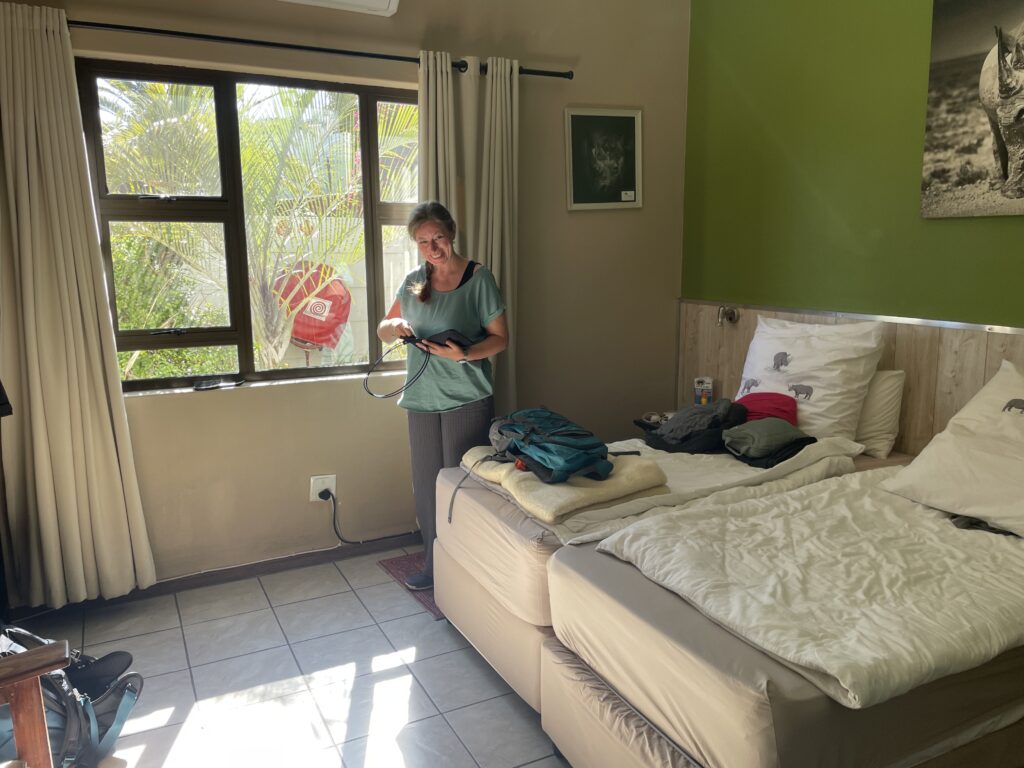Nach Windhuk waren es noch 2 Stunden. Dort wohnten wir im Eco Self Catering, ein Komplex mit Appartements, bestehend aus Esszimmer, Schlafzimmer, einem modernen Bad und einem Balkon zum Wäschetrocknen. Alles war liebevoll eingerichtet – wir haben uns dort einfach rundum wohlgefühlt. Später am Abend haben wir die restlichen Dokumentationen gemacht als auch unsere Route auf Google Maps nachgezeichnet, um die Reise für mögliche Nachahmer festzuhalten. Am nächsten Tag haben wir den Hilux bei Asco Car Hire abgegeben. Wir waren schon ein kleines bisschen nervös, da es ja das beschädigte Kabel und die angefressene Box gab. Aber es war überhaupt kein Problem. Nach 10 Minuten war die Überprüfung des Autos abgeschlossen, danach ließen wir uns noch einmal zum Hilton fahren.