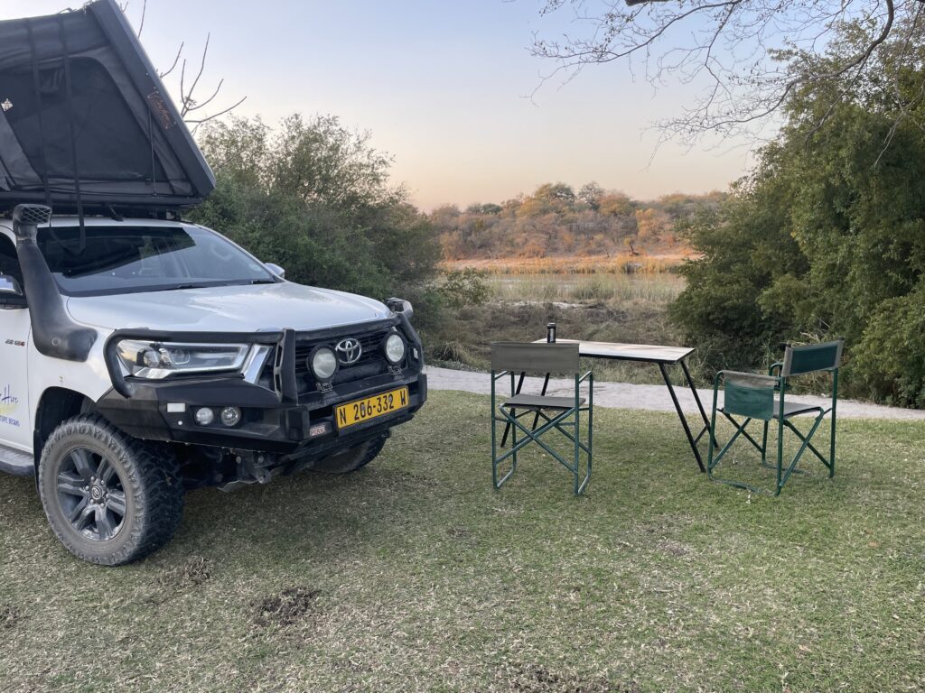 Die Mababe River Lodge ist eine ganz hervorragende, edle Lodge mit tollen Stellplätzen, die eigene sanitäre Anlagen haben, und von Bäumen und Sträuchern begrenzt werden. Diese waren allerdings auch bei den Elefanten beliebt, die nachts die Bäume „crashten“ und ein „Schlachtfeld“ hinterließen. Überall waren abgebrochene Bäume und die Kothaufen der Elefanten. Das Schauspiel spielte sich so nah an unserem Auto ab, dass es schon gruselig war.