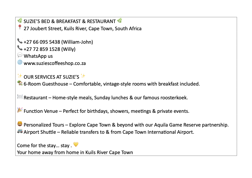 Die Unterkunftsmöglichkeiten sind sehr unterschiedlich: Vom einfachen Zelt über kleine Hütten (wie wir eine hatten) bis hin zu schönen Chalets, . Gebucht wird diese Lodge meist für Veranstaltungen, wie z.B. Hochzeiten. Die Atmosphäre war etwas konservativ, mit ein paar Sprüchen auf Afrikaans, und man merkte, dass der Besitzer und die MitarbeiterInnen recht religiös sind. Aber unsere Gastgeberin war sehr herzlich. Sie erzählte uns von ihrem Mann, der gestorben ist, und dass sie eigentlich nicht mehr arbeiten möchte.
