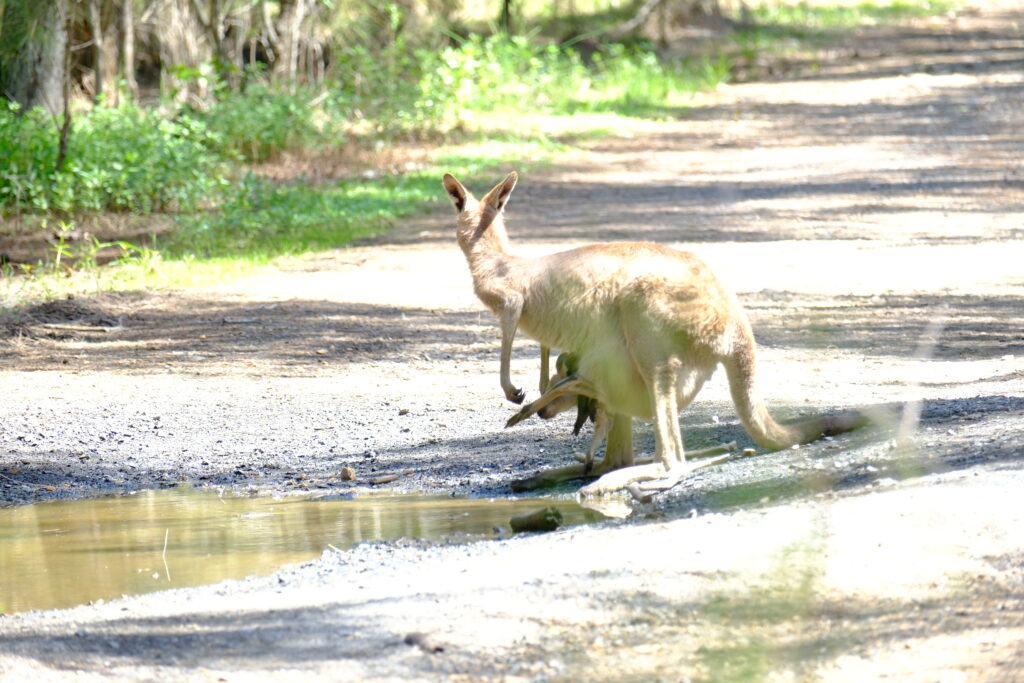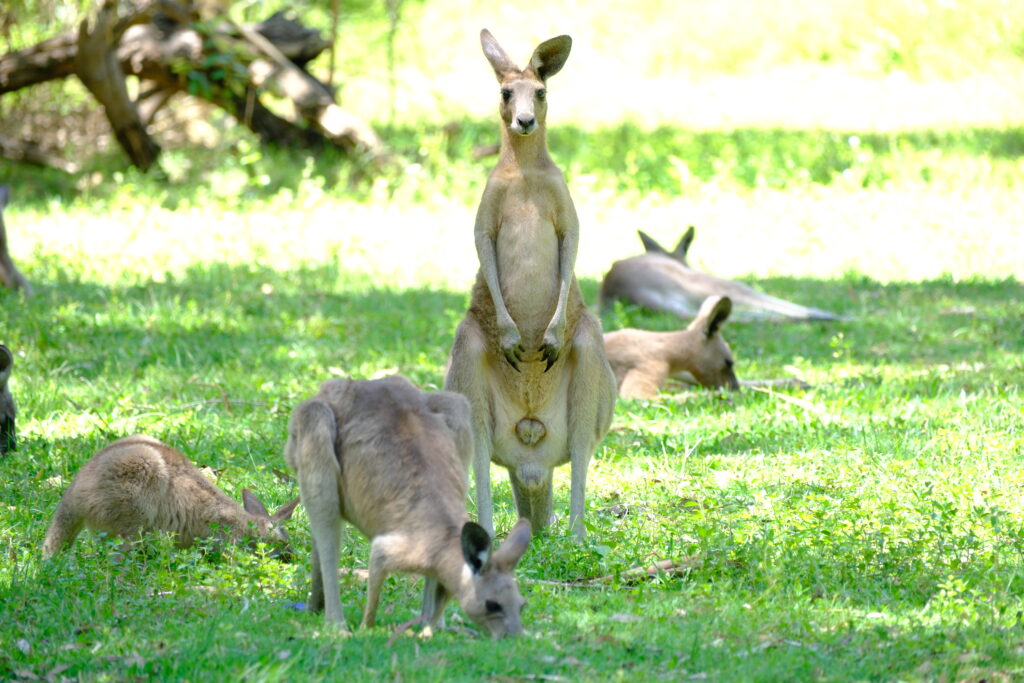 Auf dem Campingplatz selbst liefen Kängurus frei herum. Unter unserem Hibiskusbaum fraßen sie die Blüten auf – teilweise einen Meter neben unseren Stühlen. Das war schon magisch.