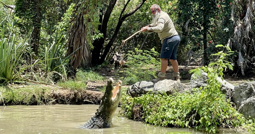 Ich habe dann später einen Rainforest Night Walk gemacht. Der Guide erzählte sehr viele Geschichten – manche zoologisch, manche philosophisch. Wir haben Spinnen gesehen (giftig und ungiftig), Frösche, und viel über Kasuare gelernt. Es gibt noch ca. 80 Exemplare im Daintree und ca. 1400 in ganz Australien. Fest steht: uralte Tiere, 60 Millionen Jahre alt, Horn auf dem Kopf, sehen aus wie aus der Dino-Zeit. Einen freien Kasuar haben wir leider nicht gesehen.