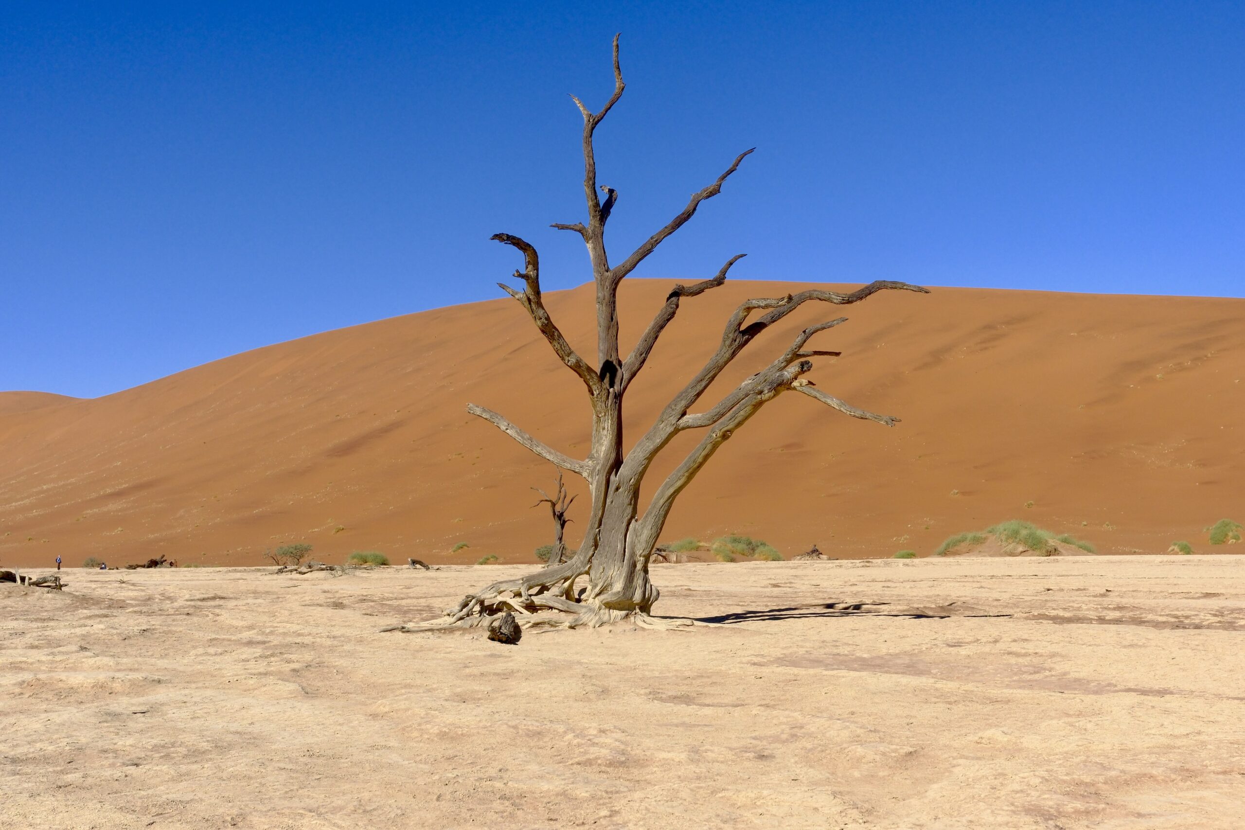 Anna: Im Dead Vlei waren viele Leute, die sich aber verteilten. Alle versuchten an einem Baum ihre Fotos zu schießen, so dass man bisschen gucken musste, wo man einen freien Baum fand. Aber man fand ihn. Überall sind unübersehbare Schilder: „Bitte nicht anfassen, bitte nicht hinsetzen, bitte überhaupt nicht in Berührung kommen“ und dann hab ich so beobachtet, wie die Guides, die die Touris begleiteten, sich einfach auf einen dieser toten „Heiligtümer“ gesetzt haben. Sie wurden von den Guards, die das Deadfly bewachten beziehungsweise beobachteten, freundlich und sehr höflich darauf hingewiesen aufzustehen. Sie taten das so, dass sich niemand beschämt fühlte, sondern sich wirklich dann auch entfernt hat. In anderen Ländern würde jemand dazukommen und brüllen lass diesen Baum in Ruhe, steh sofort auf das ist verboten, hier war das eher sehr freundschaftlich.